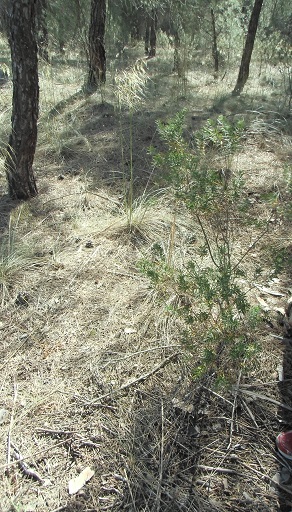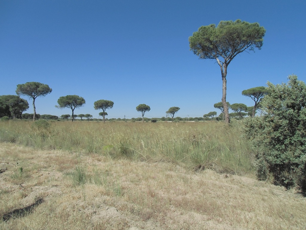 Seguimos el camino dirección al pinar. Al fondo ya se divisa la masa de pinos mixta, tanto con el tipo negral (resinero), como albar (piñonero). El pino negral se diferencia del albar porque su copa está más extendida y más vertical, y no tiene una forma tan redondeada (parasol) como el albar, y además su tesela (o roña, como se llama en los municipios de alrededor) es mucho más oscura. También divisamos alguna encina, aunque en este tramo existen pocos ejemplares de este árbol, y se dan más en el sotobosque cercano a las vías del tren que nos encontraremos más adelante. En su tiempo había mucha más encina en toda esta zona, pero se fue favoreciendo gradualmente a las especies de pino que, en principio, resultaban más rentables. Se ha demostrado con estudios de polen fosilizado, que no es que se sustituyeran las encinas por pino, sino que convivían ambas juntas, con ciertas manchas de bosque de cada especie, a lo largo de estas tierras.