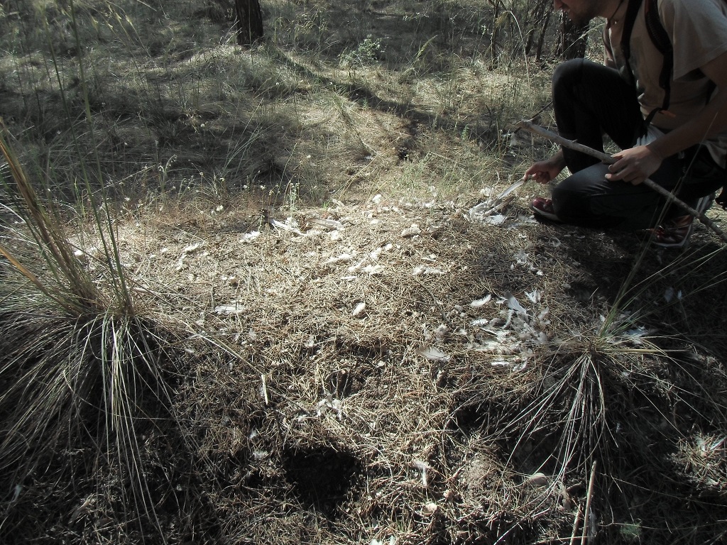 En un lateral del camino nos encontramos con lo que ha sido una comilona en toda regla. Es complicado adivinar el comensal, ya que unas plumas aparecían arrancadas (lo que delataría la presencia de un ave rapaz) y otras estaban rotas en la parte de la caña (por lo que podría ser un zorro u otro animal similar).