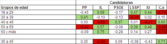 Respecto al PP, la correlación es negativa entre su porcentaje de voto por sección y el peso del grupo de población joven (menos de 30 años) y con con la población de 50 a 59, pero positiva con el grupo de edad de 30 a 39.
