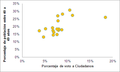 Finalmente, en el caso de Ciudadanos, su voto está correlacionado negativamente y de modo fuerte con la población de 18 a 29, 50 a 59 y más de 60. Pero se observa una correlación positiva con el grupo poblacional de 40 a 49 (y también de 35 a 45).