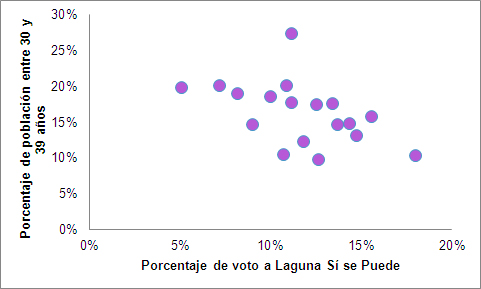 Algo similar ocurre con Laguna Sí se Puede y Laguna en Marcha. Correlaciona el voto a ambas formaciones positivamente con la proporción de población joven (18 a 29) y de población de 50 a 59 años en cada sección, pero débilmente. Si llama la atención la correlación negativa del peso del voto a Laguna Sí Se Puede y el porcentaje de población de 30 a 39.