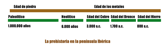 distintas eras, periodos y épocas de la prehistoria. Partiendo de las premisas establecidas, el Paleolítico hace alusión a la edad de piedra y se sitúa hasta 10000 años antes de Cristo; el Neolítico que abarca distintos periodos temporales dependiendo de los lugares estudiados, y se sitúa a partir del año 10000 antes de Cristo (en la península Ibérica se desarrolla entre el 5500 y el 3000 AC). Es en ésta última época en la que los humanos dejan de ser nómadas para convertirse en sedentarios, fijando su residencia en cuevas donde se defendían de la climatología y de las condiciones adversas, siendo este seguramente el motivo por el que tenemos ausencia de yacimientos neolíticos en las tierras del interior peninsular. La alternativa que buscaban era la agricultura y el control de pequeñas especies animales.