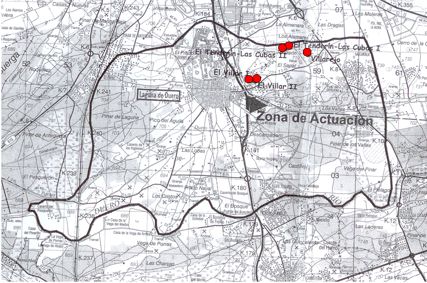 En lo referente a los yacimientos excavados en nuestro municipio, además del cuadro descrito al principio con su denominación y coordenadas fijadas en el Inventario Arqueológico de Castilla y León, a continuación remito plano del término municipal de Laguna de Duero donde figura marcado junto a su denominación las zonas de actuación: