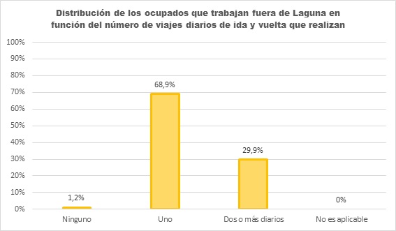 Como se observa en el siguiente gráfico, de los 6.455 ocupados que desempeñan su trabajo fuera del municipio, independientemente del medio de desplazamiento que utilicen, el 68,9% realiza un viaje de ida y vuelta a diario, mientras que un 29,9% hace dos o más.
