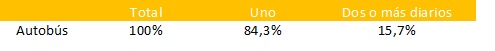 En la siguiente tabla se recoge la distribución de los ocupados que trabaja fuera de Laguna y que cogen el autobús según el número de viajes que realiza al día. Como se observa, la mayoría (84,3%) realizan un viaje de ida y vuelta.