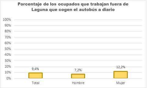 Por lo tanto, del total de los ocupados que trabajan fuera de Laguna, el 9,4% coge el autobús a diario, porcentaje que asciende al 12,2% entre las mujeres. Entre los estudiantes que estudian fuera del municipio, el porcentaje que utiliza el autobús diariamente alcanza el 40,7%.