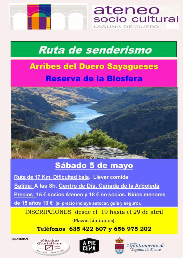 senderismo a los Arribes del Duero Sayagueses (Zamora). Será el sábado 5 de mayo de 2018, con salida en el Centro de Día en la Cañada de la Arboleda a las 8:00. La inscripción se realizará desde el 19 al 29 de abril de 2018, y es necesario llamar al teléfono 635422607 ó 656975202. El precio es de 15 euros para los socios del Ateneo y de 18 euros para los no socios. Para los niños menores de 15 años el precio es de 10 euros. El precio incluye autocar, guía y seguro.