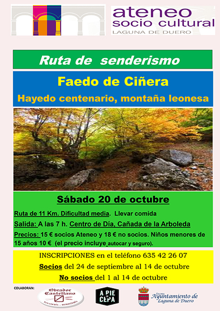 El Ateneo Sociocultural de Laguna de Duero organiza una excursión de senderismo a la zona del norte de León (Hayedo de Faedo de Ciñera). Será el sábado 20 de octubre de 2018, con salida en el Centro de Día en la Cañada de la Arboleda a las 7:00 h. Para inscribirse, es necesario llamar al teléfono 635422607.