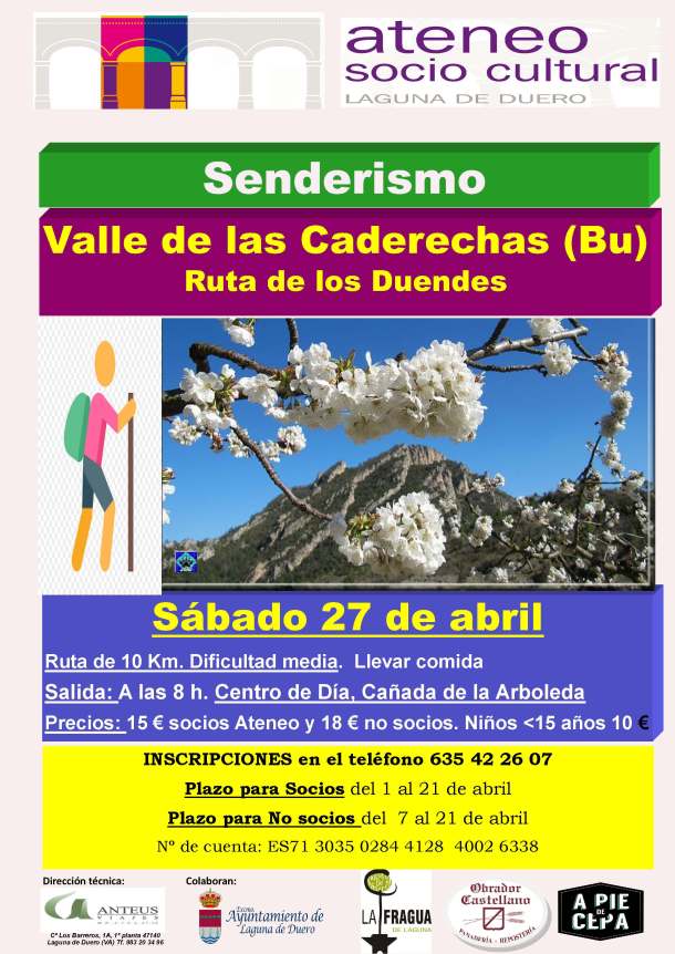 Ya está preparada la próxima ruta de senderismo organizada por el ATENEO sociocultural de Laguna de Duero. En esta ocasión nos vamos el día 27 de abril a conocer el Valle de las Caderechas en la provincia de Burgos.