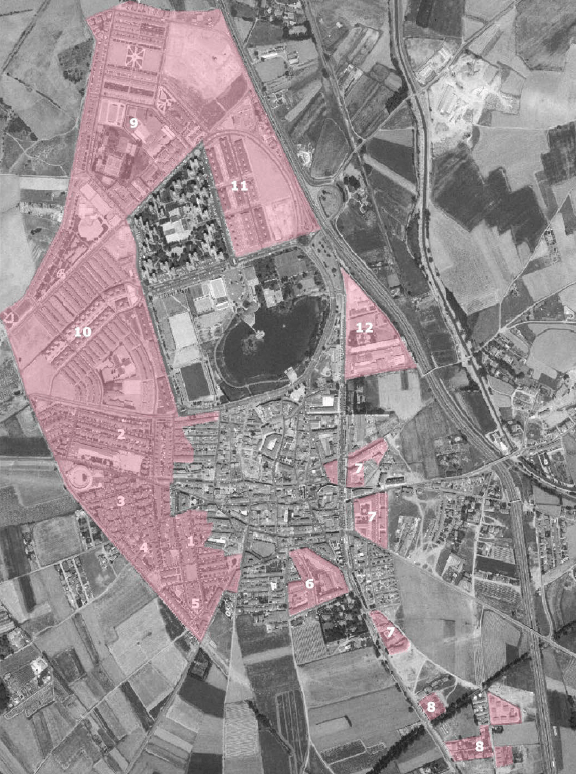 Fig. 8.- Crecimiento 1985-2000 sobre vuelo quinquenal de 1999: 1.- Puenteduero/Paseo Democracia. 2.- La Nava. 3.- La Tomatera. 4.-Los Ingleses. 5.- Las Lobas. 6.- Carmen Conde/Pensamiento. 7.- Avenida de Madrid. 8.- Camino del Pino.- 9.- Prado Boyal. 10.-Fadesa Oeste. 11.- Fadesa Este. 12.- Los Barreros.