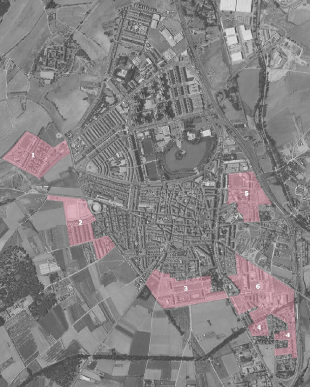 Fig. 9.- Crecimiento 2000-2017 sobre vuelo PNOA 2017. 1.- Sector Vista Alegre. 2.- Zona Oeste. 3.- Sector El Terradillo. 4.- Sector El Pino. 5.- Sector Ensanche Este-A. 6.- Sector La Arboleda.