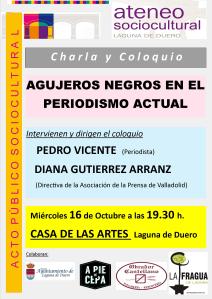 El Ateneo Sociocultural de Laguna de Duero, nos regaló el día 16 de Octubre con otra magnifica charla-coloquio. En esta ocasión dos profesionales del periodismo (Pedro Vicente y Diana Gutiérrez) nos deleitaron con su saber y su mirada crítica, sobre el momento que vive esta profesión siempre cuestionada.
