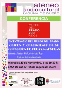 El pasado día 20-11-19 Ateneo celebró una conferencia, impartida por Javier Palomar, profesor colaborador de nuestro Ateneo, versado en Historia del Arte , Historia medieval y a la vez cronista de la Historia de Laguna de Duero. Esta conferencia tenía como fines: hacer un pequeño pero merecido homenaje a nuestro buque insignia de la cultura, El Museo del Prado y al mismo tiempo divulgar su historia en el devenir del tiempo, relatando las diversas vicisitudes vividas y padecidas por el edificio y su contenido; un compendio del arte pictórico universal. De hecho es la pinacoteca que contiene obras de artistas universales pero es la primera con respecto a la pintura Europea. Tampoco es el más visitado. 3.000.000 de vista en el año 2018, otros museos europeos sobrepasan los 10.000.000 de visitantes (p.e.el Louvre) pero su fama y prestigio traspasa nuestra fronteras y es considerado una de la pinacotecas más afamadas.