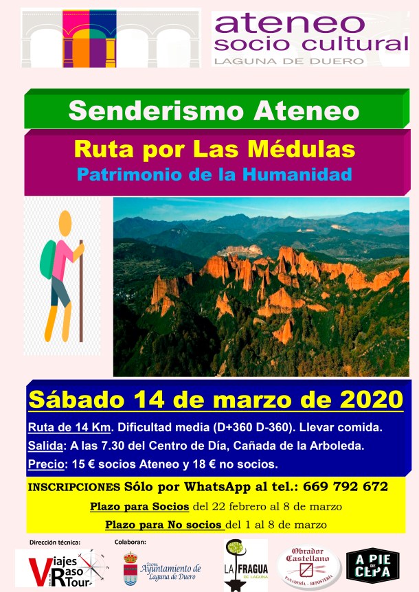 Ateneo ya tiene preparada la ruta de senderismo por las Médulas, León. Será el próximo 14 de marzo, sábado. Saldremos en el autocar a las 7.30 del Centro de Día en la Cañada de la Arboleda. La llegada prevista será sobre las 10.30 de la mañana y, como siempre, haremos una parada en el camino para el café y la pasta.