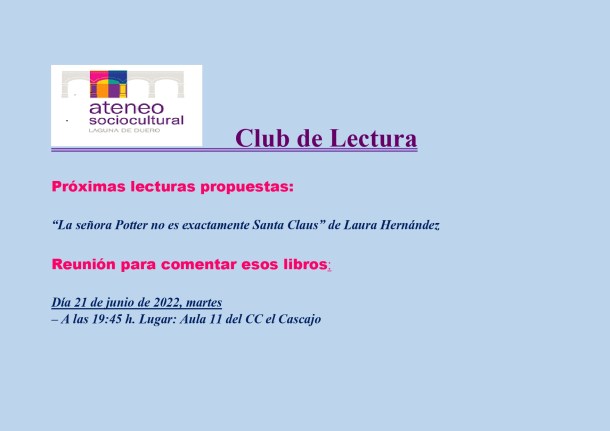 Próxima reunión de lectura el 21 de junio de 2022 Publicado el 24 mayo, 2022 por lafraguadelaguna Deja un comentario Compártelo: Haz clic para compartir en X (Se abre en una ventana nueva) X Haz clic para compartir en Facebook (Se abre en una ventana nueva) Facebook Me gusta Cargando...